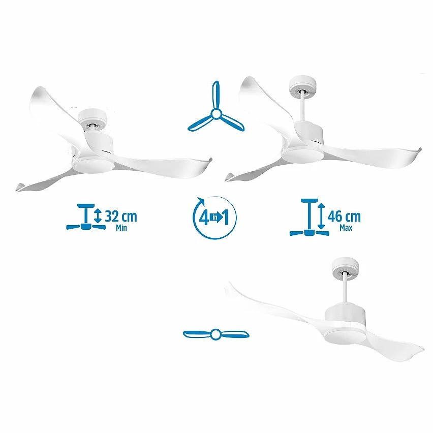 Le moteur Ă courant continu blanc DC4 permet des installations dans les plafonds jusqu’Ă 27Âș d’inclinaison et est servi avec deux tiges pour ĂȘtre installĂ© Ă la hauteur appropriĂ©e (13,5 cm et 25 cm). Il est parfait pour 2 ou 3 pales, car il dispose d’une fonction auto Ă©quilibrĂ©e. Il prend Ă©galement en charge le kit de lumiĂšre. Ce modĂšle est rĂ©versible, de sorte qu’en hiver, vous pouvez inverser ses pales pour que son mouvement dĂ©place l’air chaud vers le bas, agissant en complĂ©ment de votre systĂšme de chauffage et favorisant une consommation optimisĂ©e. Il comprend Ă©galement un thermostat Ă sa base, de sorte que vous pouvez le programmer pour que le ventilateur fonctionne en fonction de la tempĂ©rature ambiante.