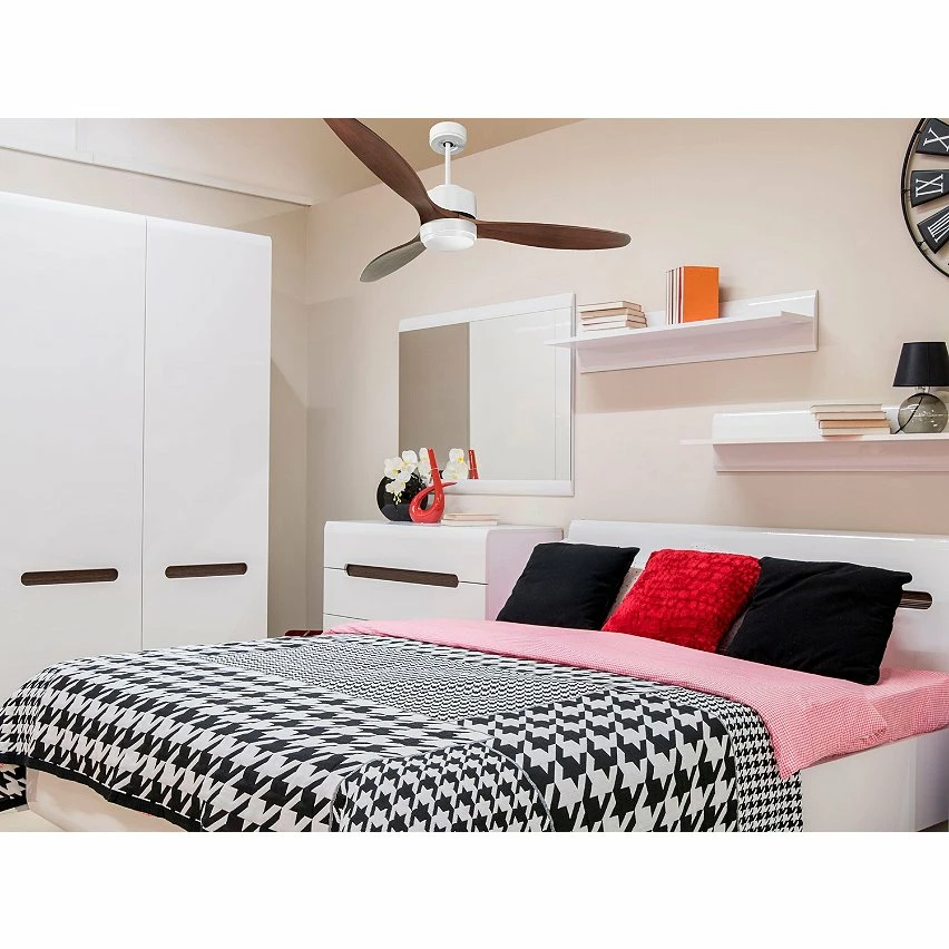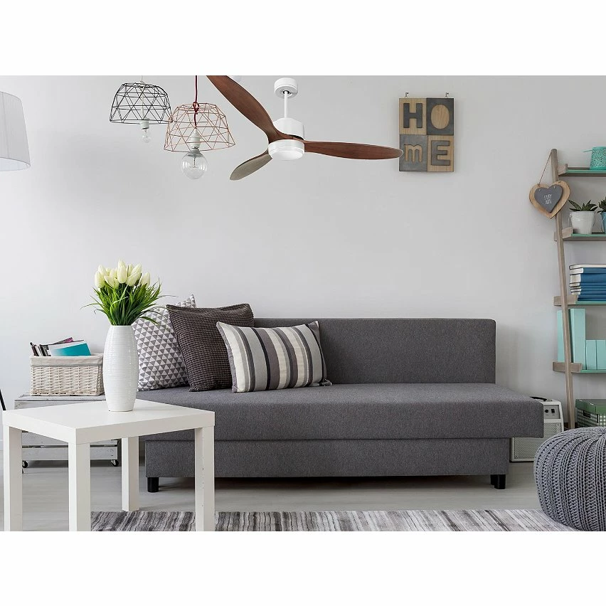 Le moteur à courant continu blanc DC4 permet des installations dans les plafonds jusqu’à 27º d’inclinaison et est servi avec deux tiges pour être installé à la hauteur appropriée (13,5 cm et 25 cm). Il est parfait pour 2 ou 3 pales, car il dispose d’une fonction auto équilibrée. Il prend également en charge le kit de lumière. Ce modèle est réversible, désestratificateur d’air, de sorte qu’en hiver, vous pouvez inverser ses pales pour que son mouvement déplace l’air chaud vers le bas, agissant en complément de votre système de chauffage et favorisant une consommation optimisée. Il comprend également un thermostat à sa base, de sorte que vous pouvez le programmer pour que le ventilateur fonctionne en fonction de la température ambiante.