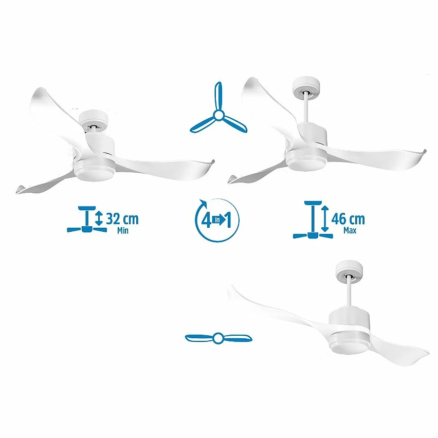 Le moteur à courant continu blanc DC4 permet des installations dans les plafonds jusqu’à 27º d’inclinaison et est servi avec deux tiges pour être installé à la hauteur appropriée (13,5 cm et 25 cm). Il est parfait pour 2 ou 3 pales, car il dispose d’une fonction auto équilibrée. Il prend également en charge le kit de lumière. Ce modèle est réversible, désestratificateur d’air, de sorte qu’en hiver, vous pouvez inverser ses pales pour que son mouvement déplace l’air chaud vers le bas, agissant en complément de votre système de chauffage et favorisant une consommation optimisée. Il comprend également un thermostat à sa base, de sorte que vous pouvez le programmer pour que le ventilateur fonctionne en fonction de la température ambiante.