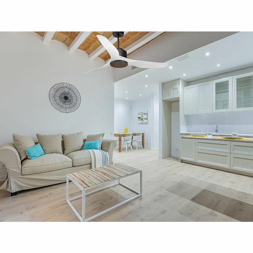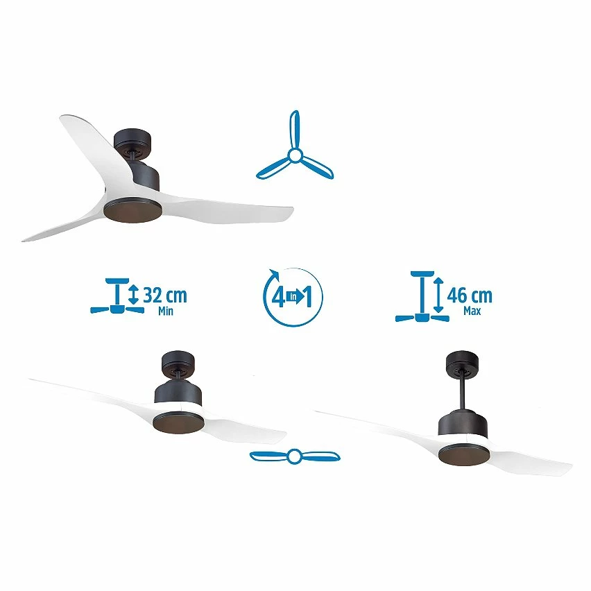 Le moteur Ă courant continu noir DC1 permet des installations dans les plafonds jusqu’Ă 27Âș d’inclinaison et est servi avec deux tiges pour ĂȘtre installĂ© Ă la hauteur appropriĂ©e (13,5 cm et 25 cm). Il est parfait pour 2 ou 3 pales, car il dispose d’une fonction auto Ă©quilibrĂ©e. Il prend Ă©galement en charge le kit de lumiĂšre. Ce modĂšle est rĂ©versible, dĂ©sestratificateur d’air, de sorte qu’en hiver, vous pouvez inverser ses pales pour que son mouvement dĂ©place l’air chaud vers le bas, agissant en complĂ©ment de votre systĂšme de chauffage et favorisant une consommation optimisĂ©e. Il comprend Ă©galement un thermostat Ă sa base, de sorte que vous pouvez le programmer pour que le ventilateur fonctionne en fonction de la tempĂ©rature ambiante.
