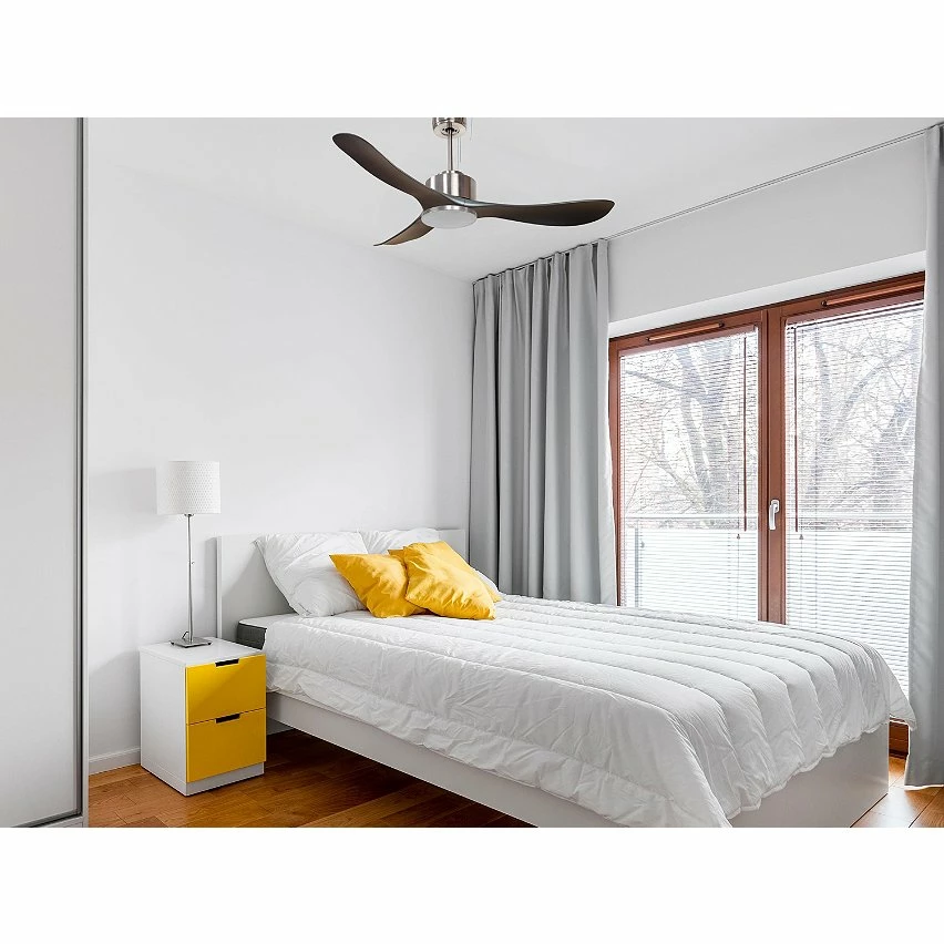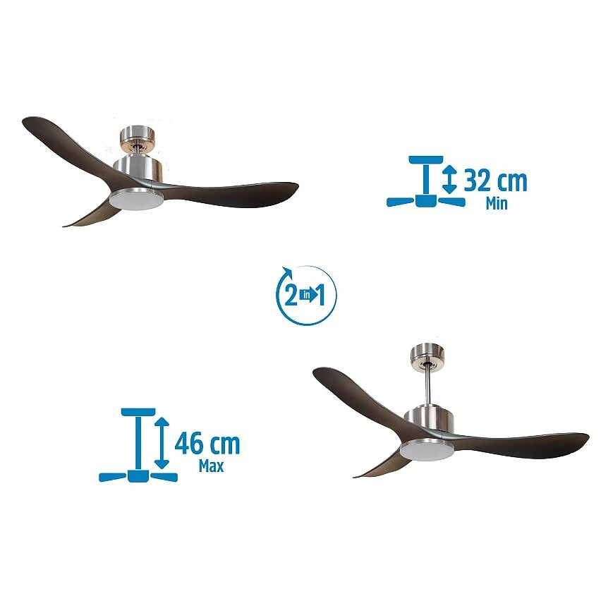 Le moteur Ă courant continu DC3 en argent permet des installations dans les plafonds jusqu’Ă 27Âș d’inclinaison et est servi avec deux tiges pour ĂȘtre installĂ© Ă la hauteur appropriĂ©e (13,5 cm et 25 cm). Il est parfait pour 2 ou 3 pales, car il dispose d’une fonction auto Ă©quilibrĂ©e. Il prend Ă©galement en charge le kit de lumiĂšre. Ce modĂšle est rĂ©versible, dĂ©sestratificateur d’air, de sorte qu’en hiver, vous pouvez inverser ses pales pour que son mouvement dĂ©place l’air chaud vers le bas, agissant en complĂ©ment de votre systĂšme de chauffage et favorisant une consommation optimisĂ©e. Il comprend Ă©galement un thermostat Ă sa base, de sorte que vous pouvez le programmer pour que le ventilateur fonctionne en fonction de la tempĂ©rature ambiante.