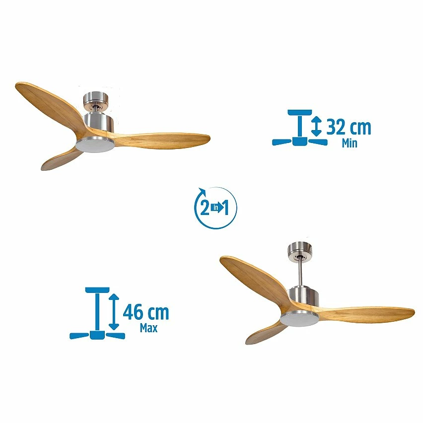 Les pales aĂ©rodynamiques en bois confĂšrent au ventilateur une grande lĂ©gĂšretĂ©, et ont Ă©tĂ© traitĂ©es Ă la main pour ĂȘtre totalement Ă©quilibrĂ©es et ne pas produire de vibrations. Ce modĂšle Ă 3 Pales de couleur marron a un diamĂštre de 132 cm et atteint une grande vitesse.