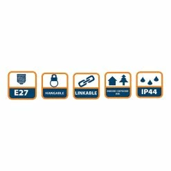 Guirlande de couleur blanche, 20 douilles E27, longueur totale 20 m, distance entre chaque douille 0,925 m. Pour une utilisation en intérieur ou en extérieur. Possibilité de connecter plusieurs cordons en série (jusqu’à 3 du même type) grâce au connecteur terminal. Ampoules non incluses. Câble H05RN-F 2 x 1 mm2, spécial pour l’extérieur (IP44). Chaque douille est munie d’un œillet pour l’accrocher. Tension d’entrée : 220/240 V ~ 50/60 Hz. Maximum: 25W par culot